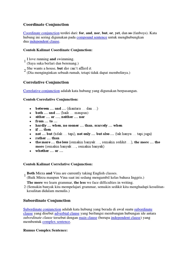 Correlative conjunction merupakan conjunction yang digunakan untuk menghubungkan kata dengan kata dan frase dengan frase dalam sebuah kalimat. Contoh kalimat correlative conjunctionbeberapa contoh kalimat dengan correlative conjunction serta macam hubungannya dapat dilihat pada tabel sebagai berikut. And coordinating conjunction, among others; Dalam pelajaran bahasa indonesia sendiri kata penghubung atau konjungsi merupakan kata penting. Merupakan kata hubung atau kata sambung yang digunakan berpasangan untuk menunjukkan hubungan baca juga: